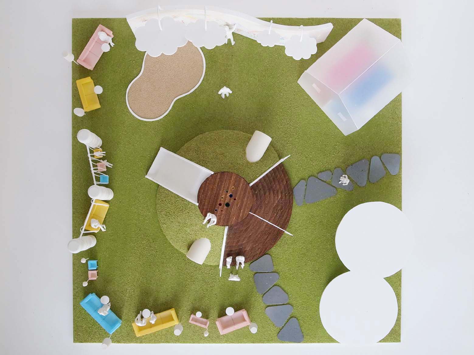 「未来の為に、まもる、すくう、できる」がテーマであったこのデザインコンペで、 公園のデザインを提案した。 現代に不足している、人々のコミュニケーションを取り戻せる場所、 子供だけでなく、大人も気軽にちょっと立ち寄りたくなるような場所を、デザインの力で作り出せないだろうかと考えた。