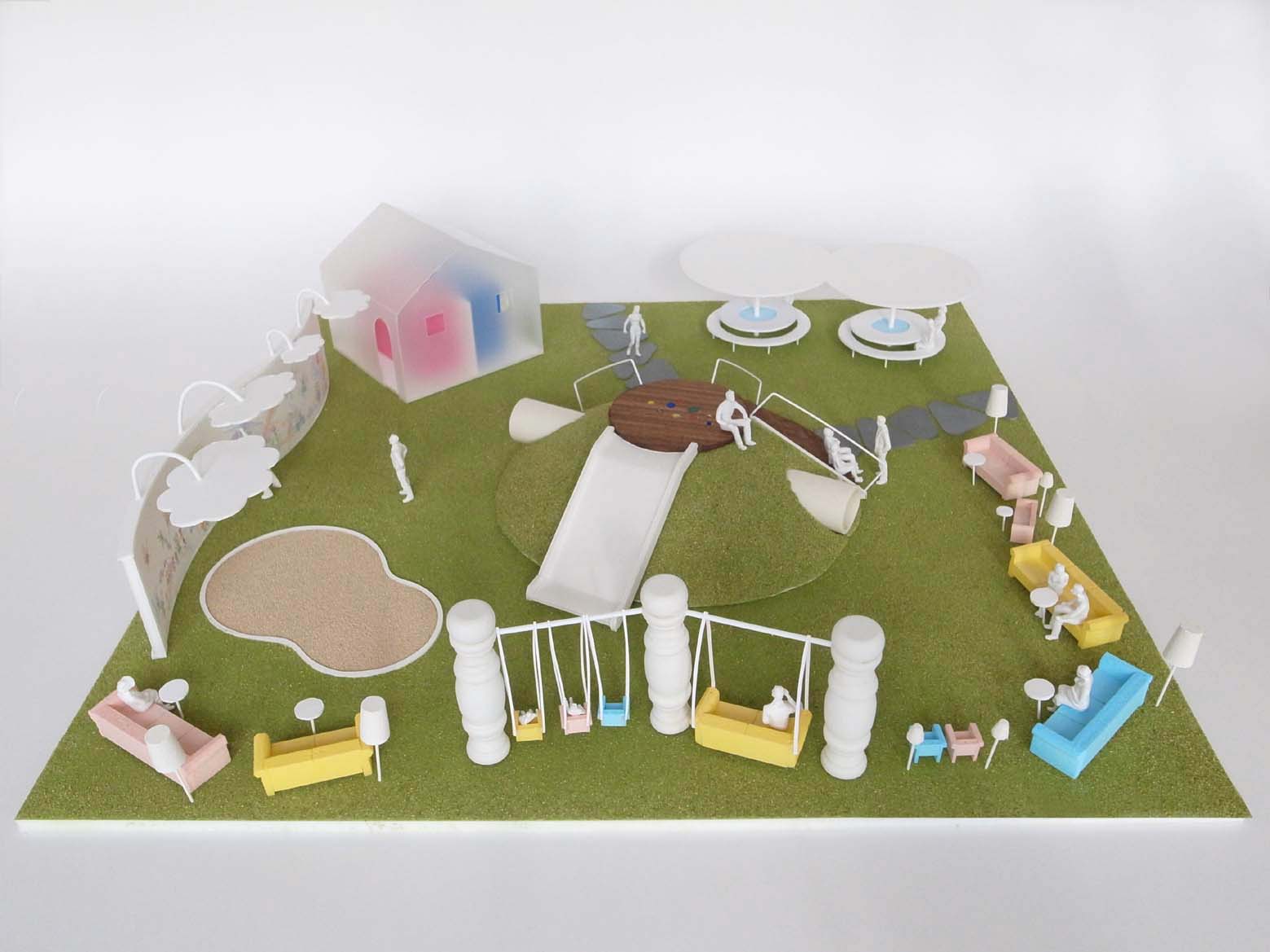 公園の中央にすべり台の丘、その周囲にはベンチやブランコ、曲線のらくがき壁がある。左奥の半透明のBOXはトイレ。 ベンチは、思わず座りたくなるようなアームソファー型のデザインとし、それぞれにスタンド照明、サイドテーブルを設けている。