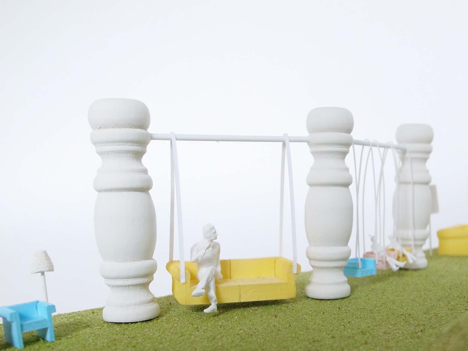 ゆったり座れるソファー型のブランコ。ブランコの支柱もデザインし楽しい印象に。